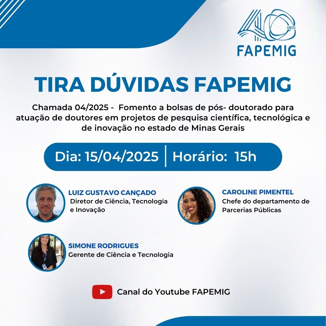 Na próxima terça-feira (15), às 15h, a Fundação de Amparo à Pesquisa do Estado de Minas Gerais (FAPEMIG) transmitirá em seu canal no Youtube a Live Tira-Dúvidas da Chamada 04/2025 – Fomento a Bolsas de Pós-Doutorado para Atuação de Doutores em Projetos de Pesquisa Científica, Tecnológica e de Inovação no Estado de Minas Gerais.