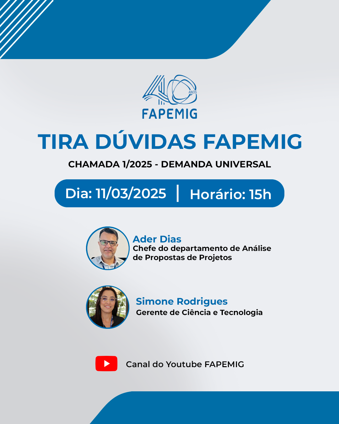 Na próxima terça-feira (11), às 15h, a Fundação de Amparo à Pesquisa do Estado de Minas Gerais (FAPEMIG) transmitirá em seu canal no YouTube a live Tira-Dúvidas da Chamada 001/2025 – Demanda Universal.  A oportunidade de fomento inclui categoria exclusiva para pesquisadores que concluíram o doutorado em 2015 para a aquisição de equipamentos de grande porte com valor igual ou superior a R$ 500 mil.