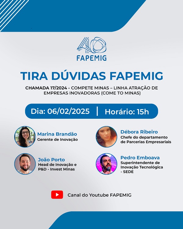 Para esclarecer pontos da Chamada, estarão presentes a gerente de Inovação da FAPEMIG, Marina Brandão; a chefe do departamento de Parcerias Empresariais, Débora Ribeiro; o superintendente de Inovação Tecnológica da Secretaria de Estado de Desenvolvimento Econômico (Sede), Pedro Emboava; e o head de Inovação e P&D do Invest Minas, João Porto.