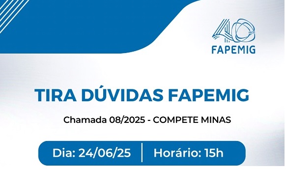 No dia 24 de junho, próxima terça-feira, às 15h, a Fundação de Amparo à Pesquisa do Estado de Minas Gerais (FAPEMIG) vai realizar a live tira dúvidas da Chamada 08/2025 – Compete Minas. A transmissão será pelo canal da FAPEMIG no YouTube.